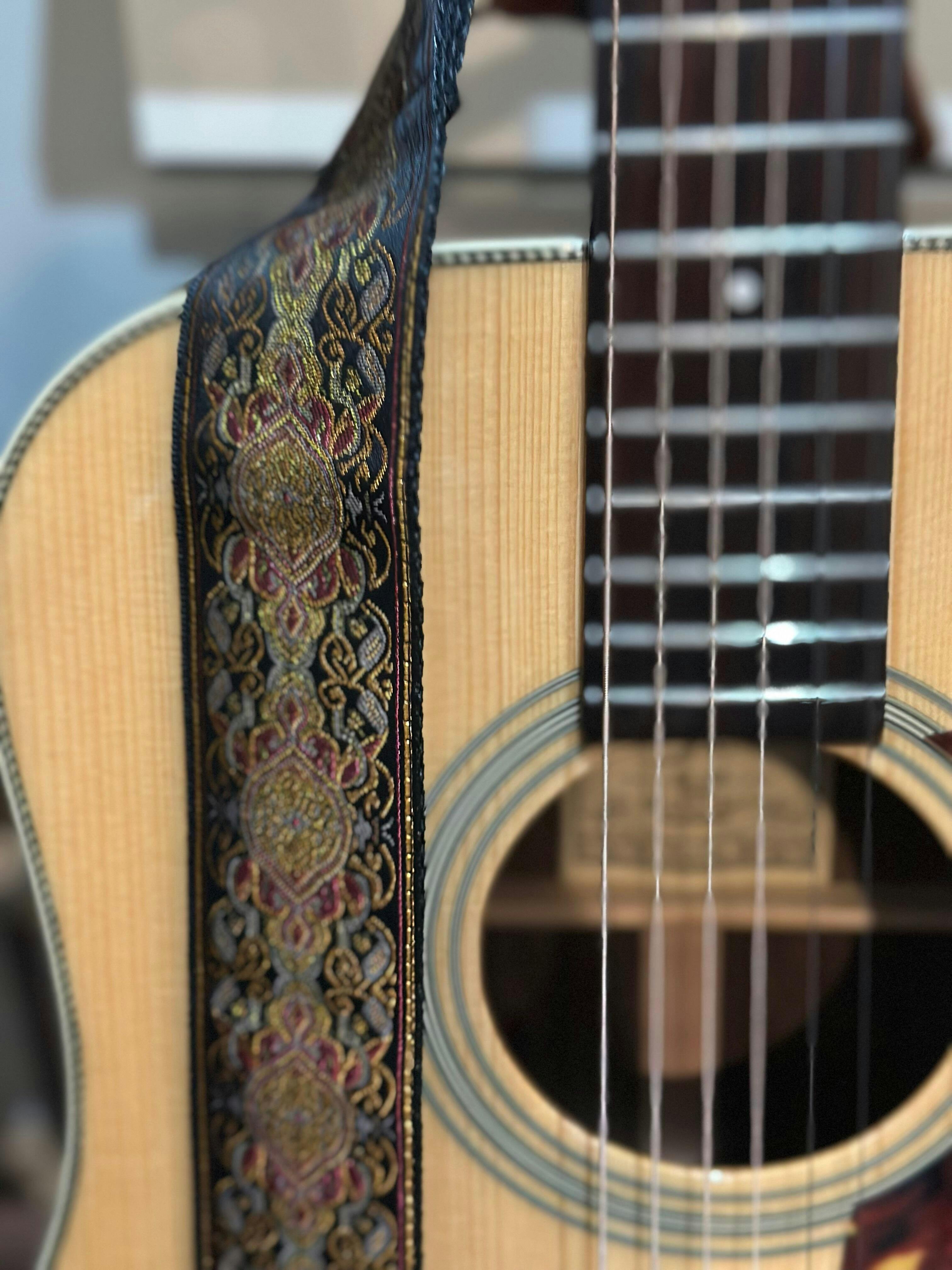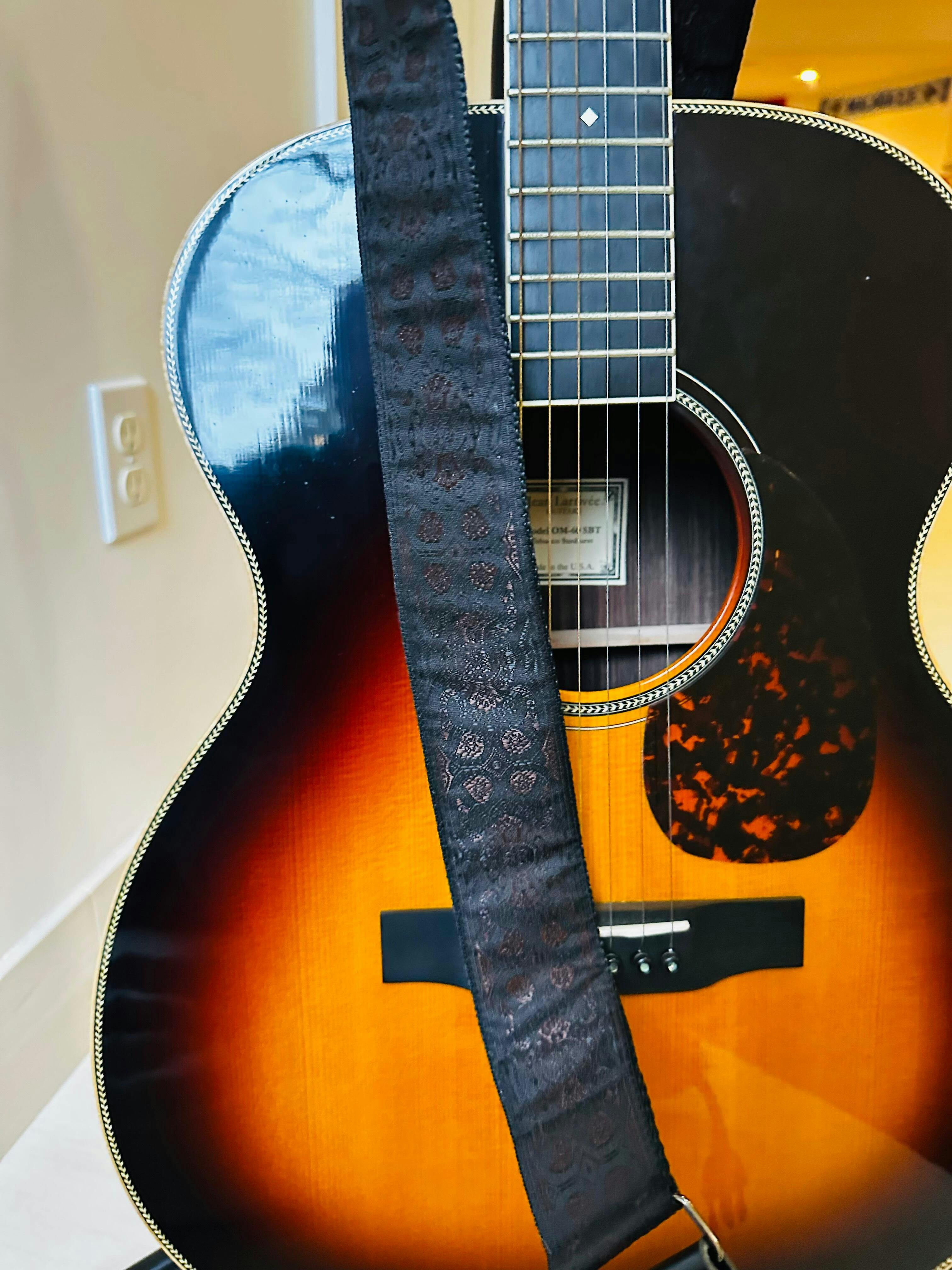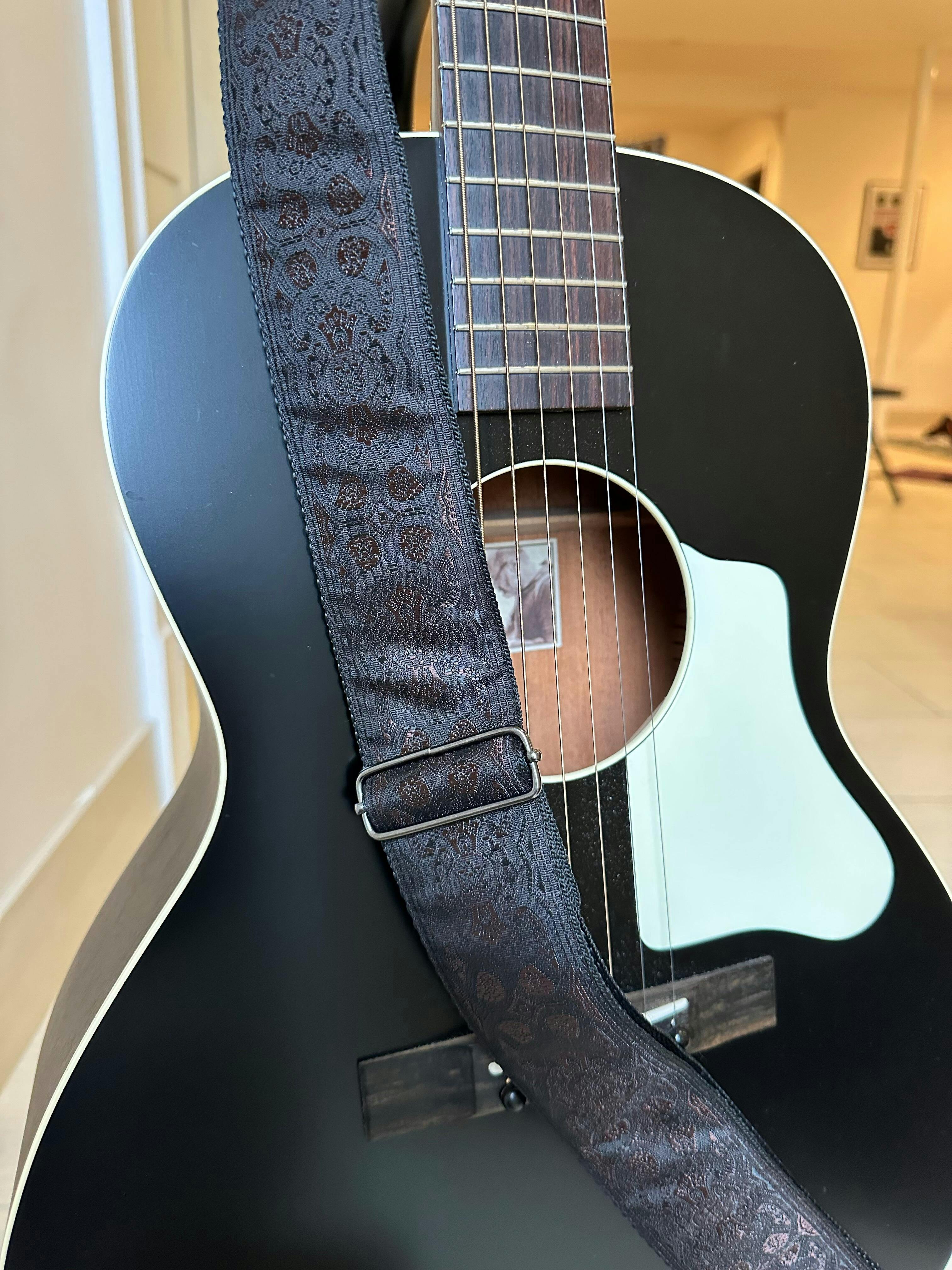 For a while I had been considering replacement guitar straps for a few of my guitars with heavy-mileage and/or just plain boring straps, especially for my black-bodied-with-white-pick-guard Waterloo acoustic. The guitar finish is matte black, and I had been using a well worn plain black matte utilitarian "seatbelt-strap" on it for the past year of ownership, and decided to search for new options, imagining I would likely have to add a color-pattern to any new strap, rather then my preference for keeping the black-white color scheme. I was looking for some variation in design that would elevate the look of the beautiful guitar. The Atmos web site popped up during the Internet search, I had not heard of this brand, but the website pictured beautiful guitar straps, and the Black Magic seemed to offer the dark base color to fit the darker color I had envisioned for the new strap, but it included some stitching providing intriguing color variation in the website photos. After reading a bit more about the company and its seemingly well-constructed, hand-made straps, I placed an order for the Black Magic (and the Taiao and Electro Bliss straps). When I received the order, I was immediately struck by the beautiful felt packing bags and it was exciting to open each to reveal exquisitely made and presented guitar straps. The Black Magic was the first strap I unfurled and set up the quick release acoustic guitar adapter and the dark color with the textured black weave was the perfect embellishment to the black of the guitar body. But the kicker was the brown-threaded Jacquard pattern woven thought out the black base fabric, providing a shimmering pop of bronze color shine which fluctuates depending upon how the light strikes the material. Through all angles of viewing, the Black Magic provided a subtle-yet definitive shimmer of beauty that accented the guitar perfectly. Construction and quality appears excellent, the visual impact of the colors are beautiful, and the presentation packaging is over-the-top! Well done!!
