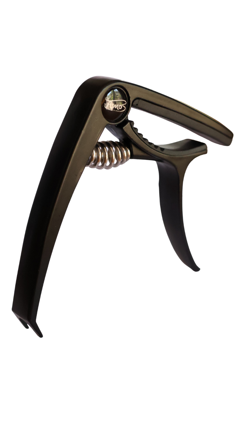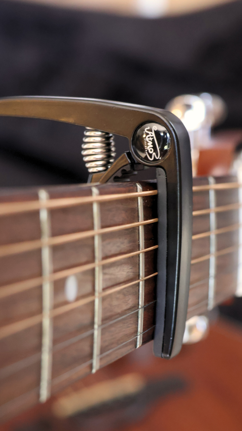 The Atmos Guitar Capo features a robust spring-loaded aluminium frame, a non-slip rubber neck grip, and a precision rubber pad that applies even pressure across the strings for a clear, resonant tone. The end of the capo includes a discreet bridge pin remover for added convenience.