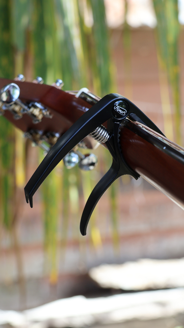 A capo simply clips onto the neck of a guitar to help players change the sound and key of their music. It’s a small, everyday accessory that many guitarists use regularly.
